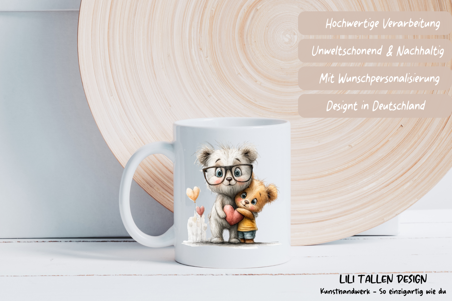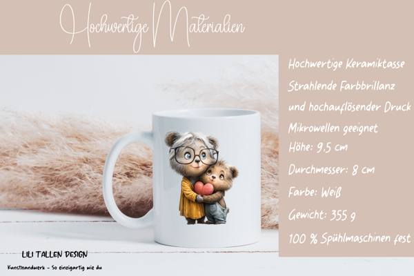 Diese hochwertige Keramiktasse für Oma oder Opa mit dem Spruch „Du bist einfach unentBÄRlich“ ist ein liebevolles Geschenk für besondere Menschen. Das niedliche Bärenmotiv mit Herz steht für Nähe, Wärme und Familienliebe. Ideal für Kaffee, Tee oder Kakao - ob zum Geburtstag, Muttertag, Vatertag oder einfach als kleine Aufmerksamkeit. Die Tasse ist spülmaschinen- und mikrowellengeeignet und fasst ca. 330 ml.