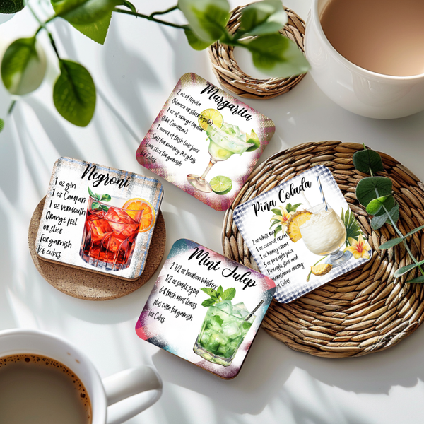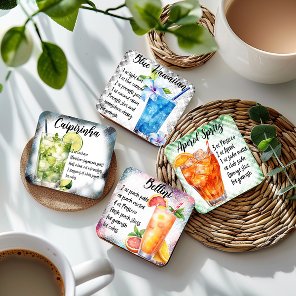 Diese hochwertigen Cocktail-Untersetzer aus MDF (10 × 10 cm) verbinden Funktion und Design auf perfekte Weise.