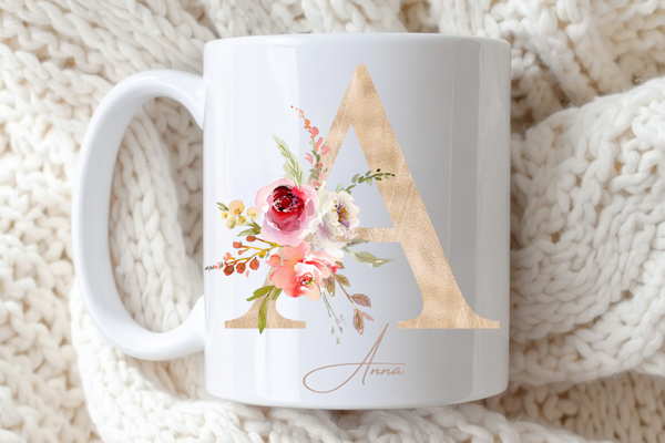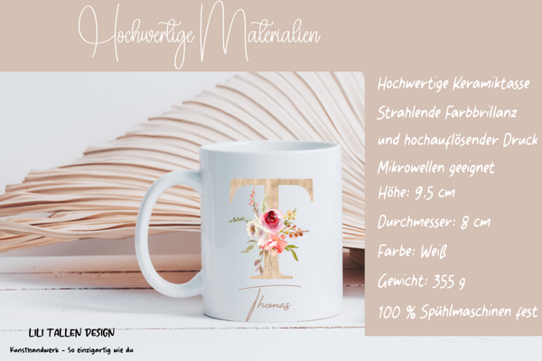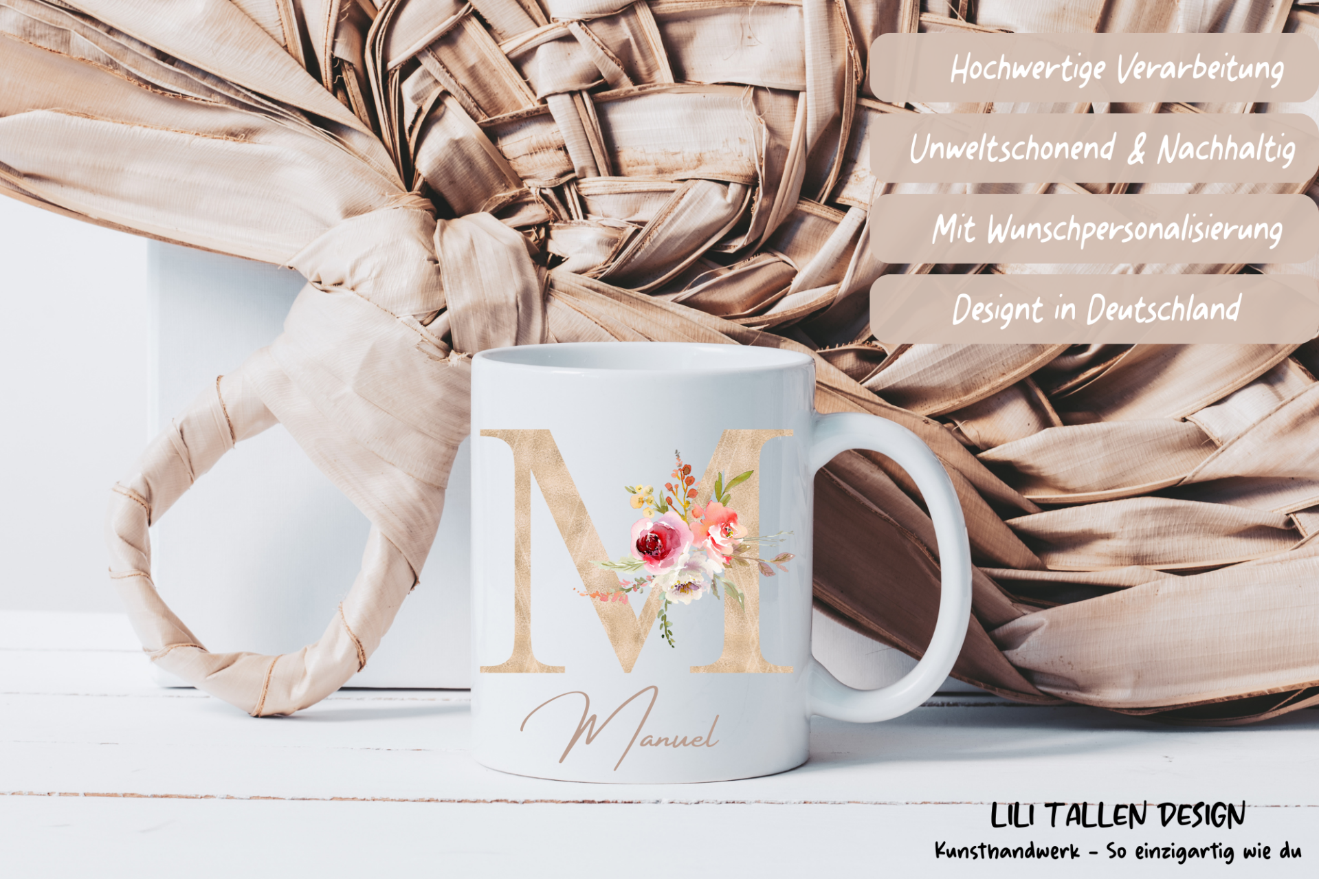 Personalisierte Tasse mit goldener Initiale und Name - Florale Buchstaben Tasse
